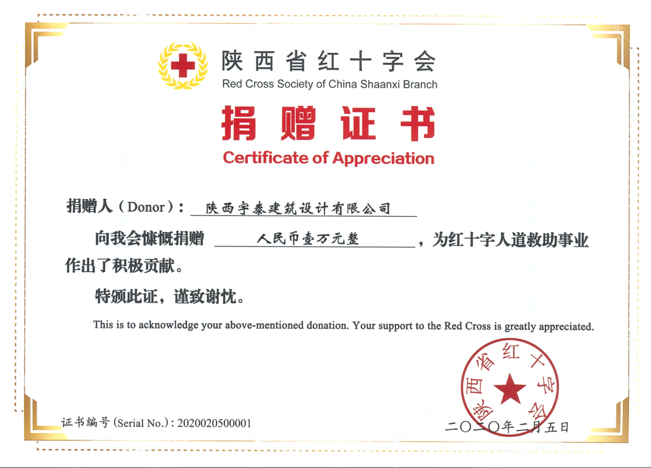 众志成诚,抗击疫情,大爱无疆,心中牵挂你我他,陕西宇泰建筑设计有限公司,通过陕西省红十字会为武汉送去爱心壹万元整,为人道救助事业贡献一份力量。慈悲济心灵,善德存大爱。没有被禁锢的城,只有离不开的爱,再艰难,爱不会离开!武汉加油!中国加油!